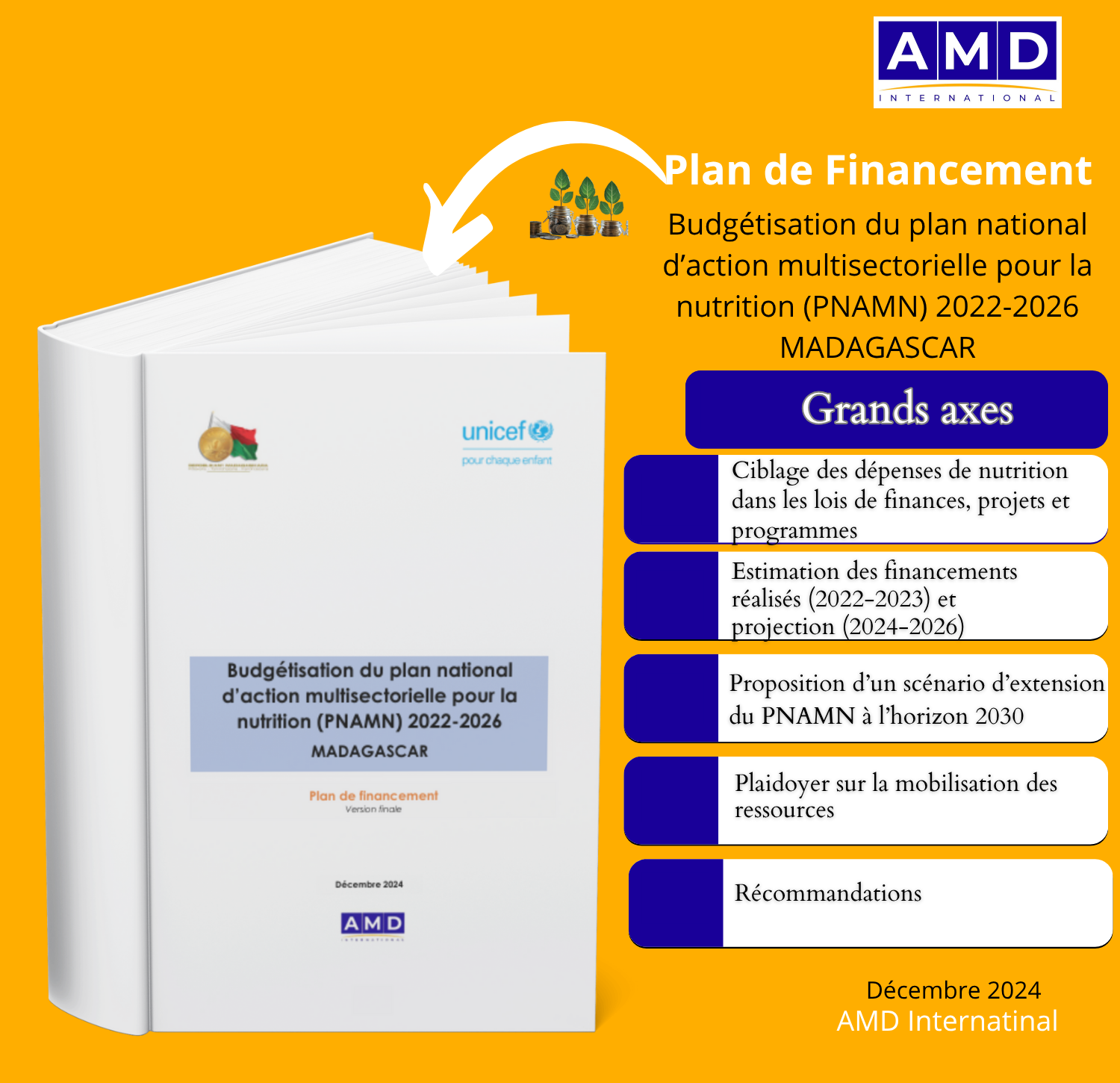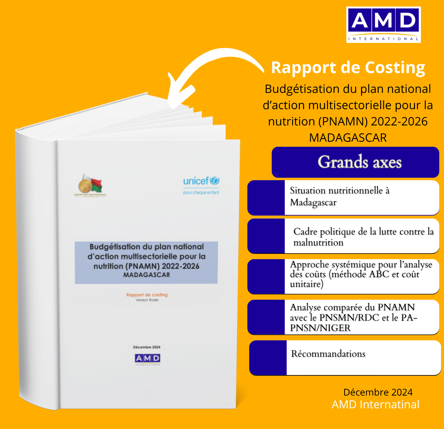 Dans le cadre de la Budgétisation du plan national d’action multisectorielle pour la nutrition (PNAMN) 2022-2026 MADAGASCAR, le Bureau d’Études AMD International a produit, en décembre 2024, deux livrables au profit du Gouvernement malgache et de son partenaire l’UNICEF.